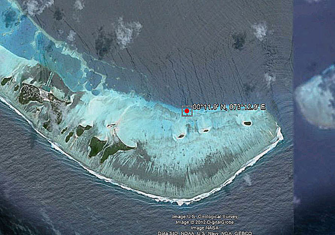 Boduhuttaa appears to be the name of the second small island west of the pass. The area is also called Faress Faru (Faress is the name of the inhabited island further to the west (where the man made harbour can be seen). There is a wide area of sandy bottom in depths between 5 and 10 metres. between our spot and Boduhuttaa.