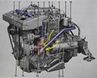 The two photos in the centre below (## 2-3) are from the real world. They show the area from above (looking in the direction of the upper yellow arrow on image #1). The part with 3 electrical connections (image #2) is the oil pressure sensor, which has to be taken out of the way. Behind it you can see the cover of the water pump. In image #3 the sensor and the pump cover have been removed, but it is not possible to get a hand in here all the way down to the pump. The red wire is the transmission operating cable and metal-color rod closer to the camera is the engine-stop (connected to the fuel pump). Image #4 shows the area without water hoses, pipes, wires, fuel filter housing and other peripherals etc (compare with image #1). It was taken when we completely rebuilt the engine in 2007.