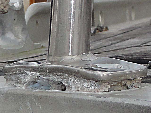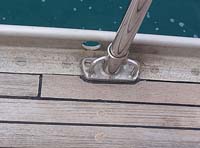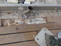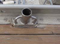 | Below we illustrate the "before, during and after" of a deck repair. We did this practically around all the stanchion pole bases on deck. The reason was, that the corrosion between aluminium (the rail) and stainless (the base) produces aluminium oxide, that pushes the base upwards (see photo in previous report, here). And because the teak ribbon was too close to the base, the ribbon was also pushed upwards. (Update: Please note that a year later we ripped off the whole deck and laid a new one, so we actually did this repair in vain.) |