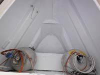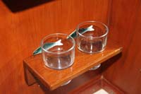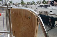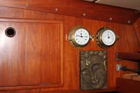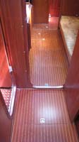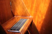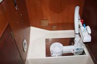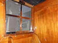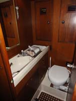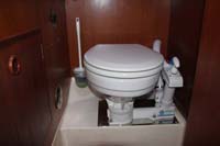 | We designed a new hatch for the companionway, photo above left. This is lockable from both inside and outside, but lets the air flow through the saloon and keeps the bugs (and other intruders) on the outside. Both toilets are new, including the mounting brackets. |