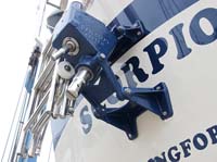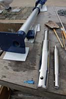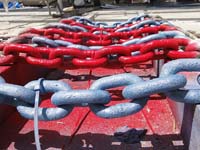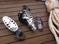 | Above (left) is the anchor chain color-marked to help monitoring length of chain laid out. On the right is an example of what a skilled mechanic can produce. The old block was made of aluminium, which had corroded badly (3rd piece from left). We had new parts done from stainless and new sheves from nylon. Cost per block was 25€ instead of 150€ for a new one! We had about half a dozen similar blocks made. We also replaced a lot of the halyards, sheets and other lines. |