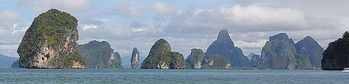 Heading north from Koh Rang Yai towards James Bond Island on a cloudy morning - soon it cleared and the sun was shining. The large island ahead is 400m high. Looking closely you can detect a mast of a sailboat about mid-island. |
