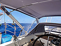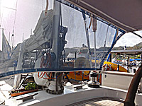 During the years we have designed various pieces of plastic and fabric for protection from spray and sun. For the comfort of the crew we have several cloths that can be attached with zippers to the bimini, alone or in combination with other clots. The photo above shows a clear windshield in combination with a clear triangle to port. Below (left) we are on a run with a shield from rain blowing in from the stern. On the photo in the middle, this cloth has been replaced by a sun shield.
