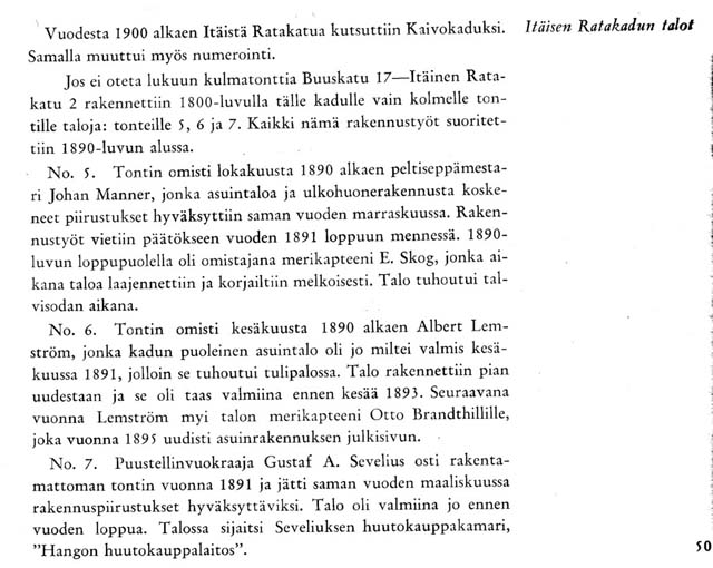 | HL 8.4.2009: | Jag hittade en sida ur någon "museibok" (antagligen skickad av Kalle) med beskrivning av Brunnsgatan 3 (III/305/1). Artikeln bevisar att huset är det samma som på "Tontti No 6" (i tidigare nämnda tomtbeskrivning), vilken från 1894 beboddes av sjökapten Otto Brandthill. Även utbyggnaden som Ingemo avser finns nämnd. För att göra frågan mer komplicerad ser det ut som om huset ändrat namn en tredje gång och nu har adressen Brunnsgatan 5 (se kartan på bild 8).