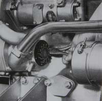The two photos in the centre below (## 2-3) are from the real world. They show the area from above (looking in the direction of the upper yellow arrow on image #1). The part with 3 electrical connections (image #2) is the oil pressure sensor, which has to be taken out of the way. Behind it you can see the cover of the water pump. In image #3 the sensor and the pump cover have been removed, but it is not possible to get a hand in here all the way down to the pump. The red wire is the transmission operating cable and metal-color rod closer to the camera is the engine-stop (connected to the fuel pump). Image #4 shows the area without water hoses, pipes, wires, fuel filter housing and other peripherals etc (compare with image #1). It was taken when we completely rebuilt the engine in 2007.