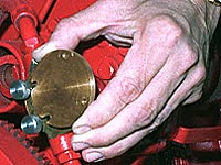 Painful as it is, however, the process is now much easier than it was when I purchased the boat. The impeller used to be covered with Jabsco's original cover, which has 6 screws that require the use of a screwdriver (image below, left). This would be almost impossible. Remember: restricted use of left hand only and no visual! More than 10 years ago I installed the Speedseal, a very clever cover kit. There are only 4 bolts, or knobs, which can be turned by hand and only 2 of them have to be taken out completely. When opening the cover, you leave the lower two bolts in place so that when you again return the cover you can just drop it in place, guided by two slits (se image below, right). The cover will stay in place by gravity until you get the two upper bolts back in place. Genius! But if I have to take out all bolts for some reason, like last time, I still have to use a tool to get the lower two bolts in place (see image #6 for a close-up and #3 for a view in action).