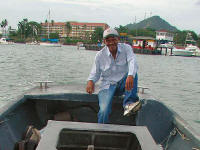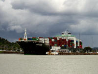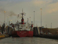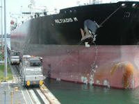 All transiting vessels, even the smallest sailing boats, are required to have a Panama Canal pilot on board. The ones assigned to sailing vessels under 60 feet are called Advisors. Our first Advisor, Rogelio, was dropped off on Scorpio by a pilot boat under way to the first set of locks coming from the Atlantic side, called the Gatún Locks. This huge hydraulic lift raises the boat in three consecutive steps, of nearly 10 meters each, to Lake Gatún. Presently most sailing vessels start their transit late in the afternoon and anchor over night in the lake after the transit of the Gatún Locks. So did even we. Sailing boats can transit the locks in three different ways: tied alongside the wall, center locked with bow lines and stern lines to both sides (4 lines), or alongside an ACP (Panama Canal Authority) tug. Going alongside the wall is not advised, because the strong turbulence can smash the vessel against the wall. When center locking, boats are usually rafted (or "nested" as they call it here) two or three together. We did our up-locking center locked, nested together with the Australian catamaran Bewdy II and the American sloop Soularity, the cat in the center. We transited the Gatún locks in the same chamber as the 543 feet dry-bulk carrier Ida's Bulker. In addition to the turbulence created by the water flow from the water filling the chamber, one of the dangers for small boats is the propeller wash of the big ships.