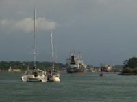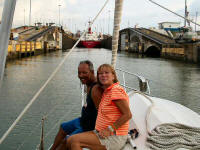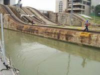 Watch a video of the Gatun Locks by clicking here. We had to postpone our transit by a couple of days because our engine started to over heat and we had difficulties in trouble shooting the reason. An engine break down during the transit could cause you thousands of dollars in penalties and towing costs. After taking most of the engine almost apart a couple of times, we found and fixed the problem in the fresh water cooling circuit and were finally ready to go. Aboard were also our English friends Sarah and Beaney and a local taxi-driver-line-handler, Rudy. The Isthmus of Panama, only about 50 miles wide at its narrowest point was, at the time of construction of the Canal, characterized by mountains, impenetrable jungle, deep swamp, torrential rains, hot sun, debilitating humidity, pestilence and some of the most geologically complex land formations in the world. The area has been subjected to several periods of submersion beneath the sea, thus adding cavities of marine materials to the geological mix. This, in addition to there being six major faults and five major volcanic cores in just the short distance between Colon and Panama City adds to the area's geological challenges. Engineers of the time of starting the project were unaware of this complex isthmian geology, and perhaps fortunately so, for it might have frightened them off. Finally, both malaria and yellow fever were endemic. For several hundred years, outsiders who came to this “Fever Coast,” especially seamen passing through, died from diseases purportedly caused by "miasmal mists" supposedly emanating from swamps and marshes. The relationship between mosquitoes, malaria and yellow fever had not yet been proven when the Canal project started. However, three natural features made Panama the ideal place to build the canal: the narrow isthmus, a mighty river and exceptionally abundant rainfall. Because of these conditions the engineers of the second (American), and successful building project, decided to build a canal with locks instead of a sea level canal. By building a dam near the mouth of the Chagres River, a navigable lake, Lake Gatún, was created 26 meters above sea level. At one time the biggest artificial lake in the world, it stores the water needed for the lock operations. The concept, in which water plays the main role, is actually very simple and does not involve any pumps; the huge hydraulic lifts work by force of gravity alone, because there is plenty of water up in the lake.