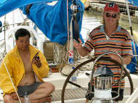 Our advisor on the second day was Jimmy Woo. He is the most experienced of all advisors and has made more than 500 transits on sailing boats and also holds the record number of 86 transits during one season. Before noon we had crossed the Gatún Lake and passed through the Gaillard Cut and arrived at the Pedro Miguel Locks, where we dropped almost 10 meters to Lake Miraflores. We were again nested together with Soularity, but the cat Bewdy II was replaced by the Norwegian sloop Hippocampus. The Miraflores Lake is only about one mile wide and therefore we crossed it, without breaking up the raft, to the Miraflores Locks where we were lowered by means of two tiers the remaining 20 meters to the level of the Pacific Ocean.