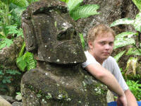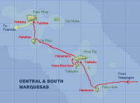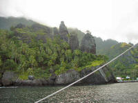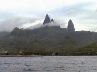 Next we visited the island of Tahuata, which is where the White Man first set his foot upon Marquesan soil. The Spaniard Alvaro Mendana landed in 1595 killing 70 Marquesans (he left behind a total of over 200 dead Polynesians). Captain Cook also visited this island, landing in a bay that he named after his ship: Resolution. After a brief stop in Hanamenu bay on the north west coast of Hiva-Oa we sailed to Ua-Pou 60 nautical miles to the NW. This island has a very dramatic skyline: several jagged volcanic plugs loom above and behind the main settlement at Hakahau bay. Fortunately the skies were relatively clear on the afternoon of our arrival and we could admire the suger loaf shaped mountains. During the following days they were completely covered with clouds. One of these peaks was the inspiration of Jacques Brel's song, "La Cathédrale".