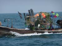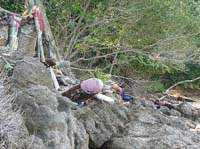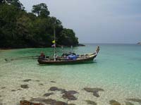 On the photo above (left) you can see the clear water at Koh Rok Nok, where two fishing boats are taking a break. Somebody had built some kind of shrine with phallic sculptures ashore. If you look closely at the photo in the middle, you can see two of the fishermen napping on the rocks on the right hand side. |