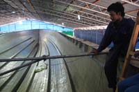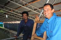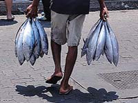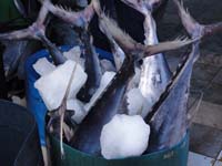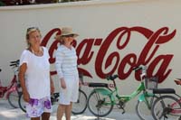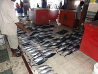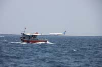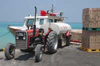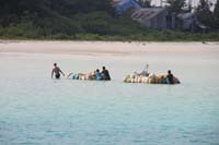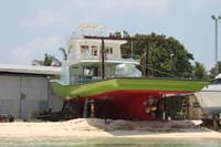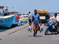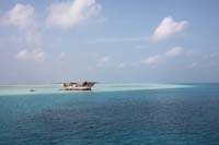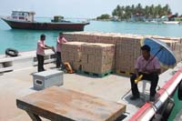 Thulusdhoo is an industrious island, with a Coca Cola factory, a customs warehouse for dried fish for export and boat building yards. Apparently this is the only place in the world where they make Coke from desalinated water. In the two photos below to the left we are being shown the mold where they were building a 30 metre cargo ship. The fishing boat on the photo to the right is of a traditional, shallow wide stern, design, but made from fibre glass. Thulusdhoo is also one of the surf centres of the Maldives with two surf breaks, one of which is named Cola after the bottling factory, and nicknamed Coke, what else. |