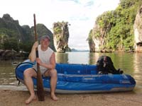 Phang Nga bay is protected from the ocean swell and one can find anchorages almost anywhere in depths between 5-10 metres on the leward side (east or west depending on the prevailing monsoon) of many of the rocky islands. The holding is usually excellent in mud and a pressurised deck wash hose for cleaning the chain will be appreciated. The water is not clear here because of a combination of the muddy bottom, the estuaries and the tidal movement. Serious swimming will have to be postponed until the Krabi area. On the way to or from James Bond Island I recommend a stop at Koh Hong (not to be confused with another island by the same name mentioned later) if you can time it to avoid the tourists. Here you can take the dinghy into the beautiful hong with its enclosed pool and large chimney opening. |