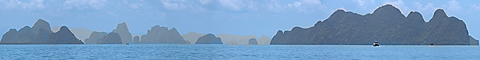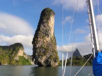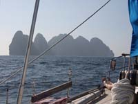 Leaving Phang Nga Bay - Krabi next The pinnacle we anchored at is on the horizon |