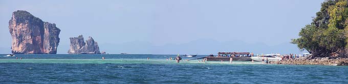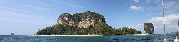 The trip from James Bond Island to the Krabi area can be done in one day or you can stop for instance at Koh Roi, Koh Pak Bia and/or Koh Hong (not the one in Phang Nga Bay mentioned earlier). Anchoring in the wide Ao Nang bay is normally possible only during the NE monsoon. Other times of the year you need to find protection from the swell behind islands in the Koh Dam group, just a mile or two to the southeast. (The two panoramas above are from those islands.) Being anchored at the eastern end of Ao Nang (Laem Nang area) will drive you crazy because of the heavy traffic of local longtails (without silencers) transporting tourists to and from the easternmost beaches (which have no road access). It is better to favour the west side closer to Koh Sam. Restaurants, hotels and shops are all along the main beach at Ao Nang. It is 20 km by car from Krabi. Phuket's Boat Lagoon Marina recently opened a sister facility at downtown Krabi, called Krabi Boat Lagoon. We have not visited this marina and do not know how to approach it trough the shallow waters in that area. |