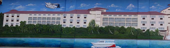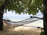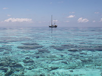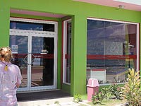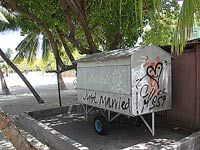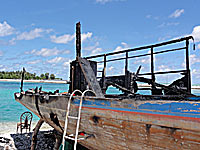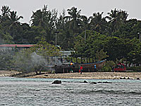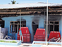 Our visas would soon be expiring and we had to carry on after only one day at Foamullah. Our final stop in the Maldives was at Gan in Addu atoll, where we anchored in the vicinity of one of the recently burned police stations. Ther was no sign of unrest or demonstrations anymore, just the evidence of past riots, including the broken window at Mullah's supermarlket Two Plus One (Mullah is an active member of the NDP). Apparently all wasn't over though; on our second day we witnessed a fishing boat on fire close to our anchorage. Somebody had decided to get relief for his frustrations? Read more about how the recent unrest in the Maldives had affected us: Political unrest and Routing Decissions. |
