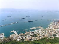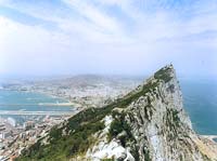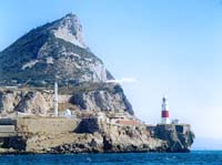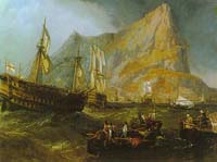 After a stop at Vilamoura we headed for Gibraltar, passing the area of the Battle of Trafalgar on the way, again crossing the path of Admiral Nelson. On the painting below (middle) HMS Victory is being towed from Trafalgar to Gibraltar; you can see the same contour of the Rock as on the photo to the left. |