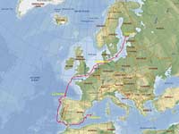 In Falmouth I was joined by Janne who would crew with me all the way to Gibraltar. During the first two days of our crossing of the notorious Bay of Biscay the seas were dead calm, but the remaining two days we had plenty of wind and confused seas, so, on average I guess you could say that the weather was moderate. In Galicia we day-sailed for a while and stopped at La Coruna, Lage, Muros and Bayona before we took off on a longer leg, down the Portugese coast and around Cabo Sao Vicente (the most southeastern point of mainland Europe) to Lagos in Algarve. of our track from Falmouth to Gibraltar |