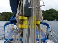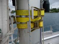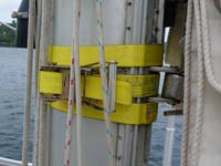 Fortunately we didn't have to face any adverse conditions on this trip and we got safely into harbour under reduced main. On Tanna, our first island in Vanuatu there are no repair facilities, so any further measures had to wait until we reached the capital, Port Vila. Well in Vila, I decided that a proper permanent repair would necessitate the mast to be pulled out of the yacht, which I hesitated to try to organize in this port. Because the fitting still appeared well secured to the mast on the port side I started to design a temporary solution. The temporary solution I did not want to break loose also the port side of the boom fitting trying to make a patch on the mast, thinking that I would only make things worse. The solution I finally came up with was pulling the fitting tightly to the mast using three straps around the mast tightened by ratchet type locking handles (the type used for securing loads on trucks). I found some heavy duty ones in a hard ware store and then modified the webbing straps using my Sailrite sewing machine.