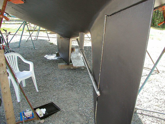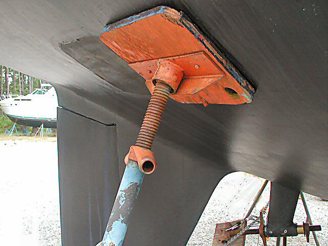 Having said that, now that it's all over, I'm glad that I vent through all the trouble. The whole project finally included pulling out the shaft using a home made jack rig, cutting out the stuffing box with a knife and sawing the cutless bearing out of the strut. And then replacing and installing new parts in place of the broken stuff. Plus sending the propeller to a work shop for inspection. The propeller had to be taken off the shaft anyway to allow withdrawal past the skegg (see photo below) and I figured that maybe the vibrations I had felt were caused by an unbalanced propeller. The process sounds simple, but the project lasted several days. Not only were the jobs difficult, but they also returned the wrong propeller!