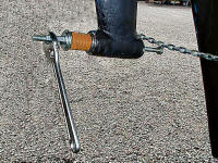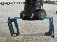 Back to Virginia, September 2004. Even though I've had the shaft out just one year ago it was stuck so hard inside the coupling that I had to be really imaginative to get it out. I constructed a big jack assembly using a car jack, a jack stand, some big pieces of lumber and a heavy stainless wire. The idea was to attach the wire around the 3 bladed propeller (still attached to the shaft) and use the jack to pull out the shaft. However, we had no strong point behind the stern of the boat where to pull from. Therefore I built a vertical platform behind the stern using a jack stand and pieces of lumber. This way the pulling forces would be directed against the hull of the boat and the ground. All items used were found lying around the yacht yard. The jack I had found there a couple of years earlier and successfully used for breaking out the mast step (there is a separate story about that project) . But you could borrow this kind of a jack from any automobile owner.
