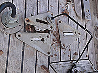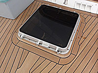 The old decks were originally 12 millimetres thick and had worn to about 8-10 mm. This time I decided to have 15 mm. When the decks were laid and we cut out the holes for new deck prisms (above, middle photo) I measured the teak in that spot to be 17 mm! The photo on the right above shows the new mellon shaped deck prism, hatch covers with zippers and the new halyard cleats on the main mast. We also replaced a lot of hard ware on deck. Below is an example showing (to the left) the masking plates of the chain plates after the chain plates had been removed. To the right is a photo afterwards, when the chain plates are back after service and the deck plates have been replaced with stainless (the old ones on the left were of aluminium).