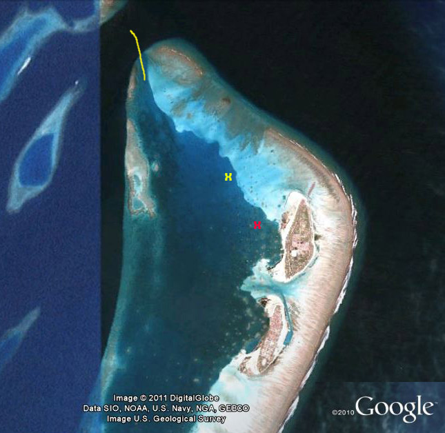 Our first anchorage is (approximately) indicated by the red x. We moved to (approx) the yellow x. As you can see, there are a lot of bommies within five cables from the shores of both Meerufenfushi and Dhiffushi to the south. You do not move around there if visibility is restricted. Look at the following image for a little closer look.