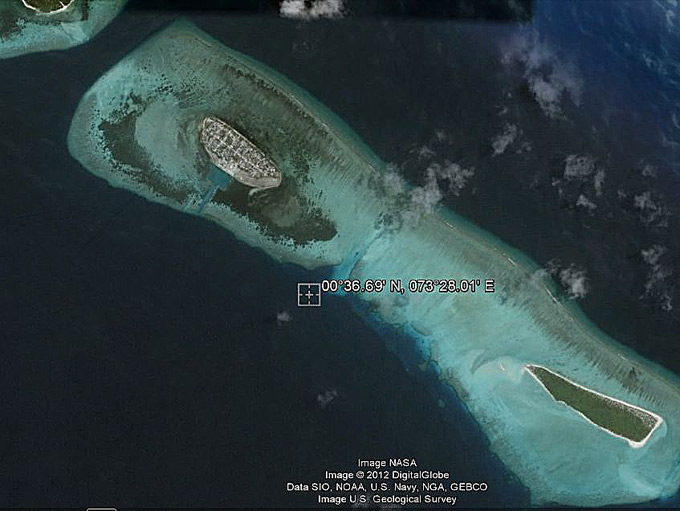 Dhandhoo is actually the name of the inhabited island to the NW of the anchorage. Therefore I have called the anchorage Dhaandhoo Faru. Faru is the Dhivehi (Maldivian) word for reef.
